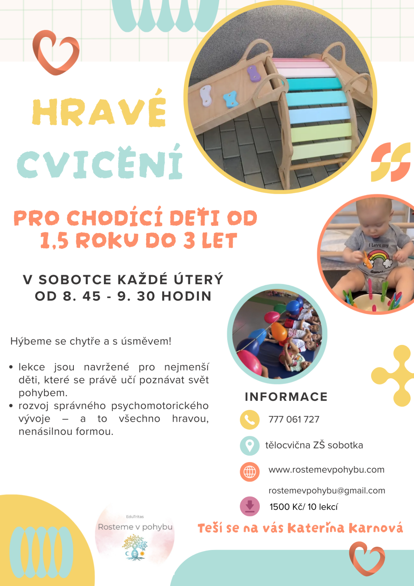 na základě vstřícnosti vedení základní školy v Sobotce bude od 23. 9. 2025 každé úterý probíhat hravé cvičení pro děti od 1,5 roku do 3 let. Přihlásit se můžete přes rostemevpohybu@gmail.com nebo na telefonním čísle 777 061 727. Děkuji za vaši podporu a trpělivost. Katka.